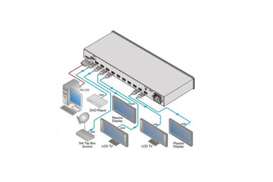 Kramer VM-28H усиливает и перераспределяет HDMI-сигнал, а также компенсирует потери в кабеле и осуществляет реклокинг. Устройство имеет пару входов. Сигнал с каждого из них может по выбору отправляться на 8 идентичных выходов.